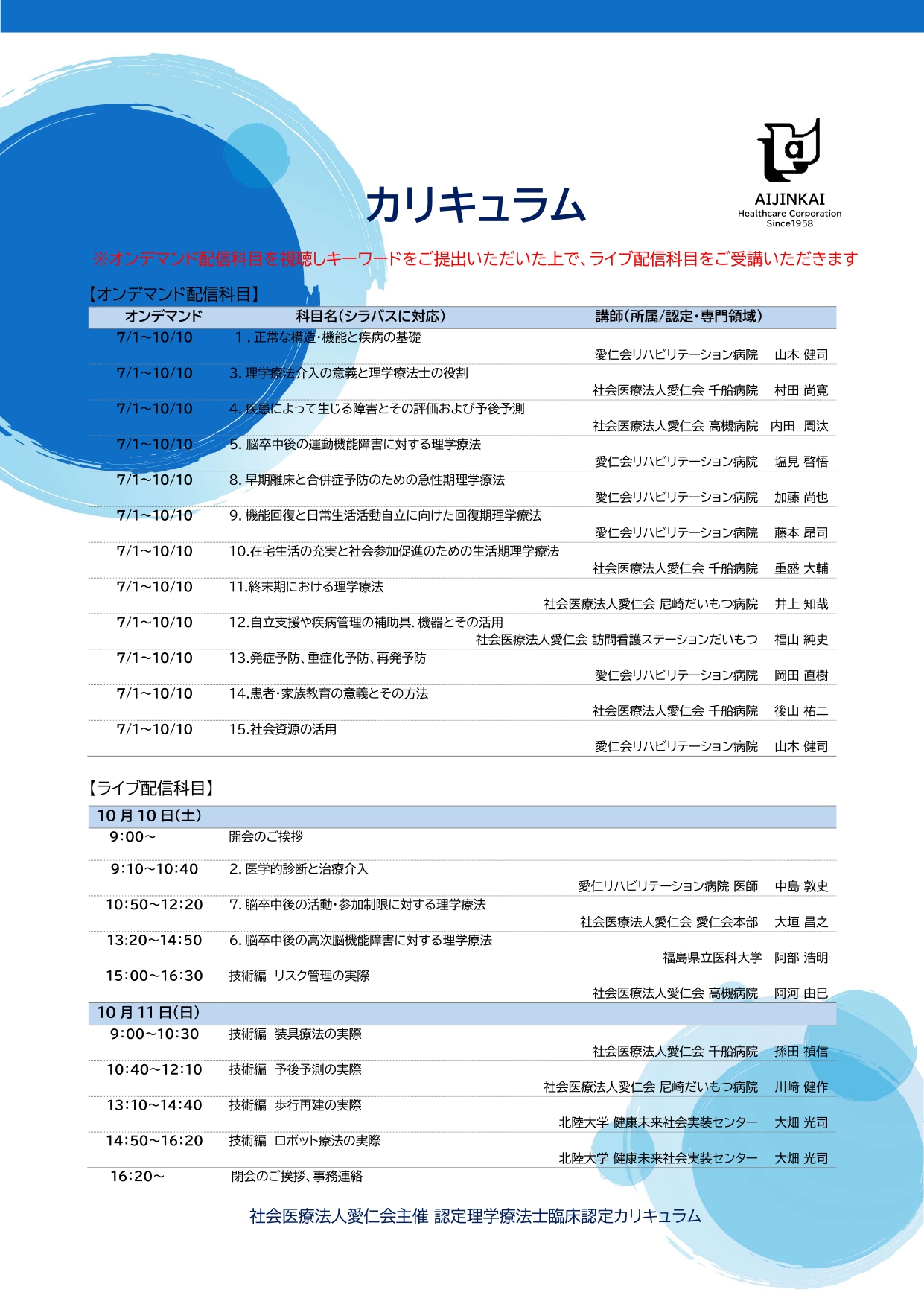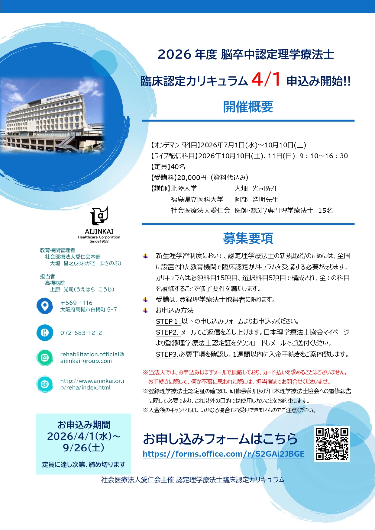 愛仁会グループリハビリテーション部門では、2026年度 脳卒中認定理学療法士臨床認定カリキュラム受講生を募集しています。脳卒中認定理学療法士を目指している方、臨床認定カリキュラムのご受講は愛仁会でお願いいたします。